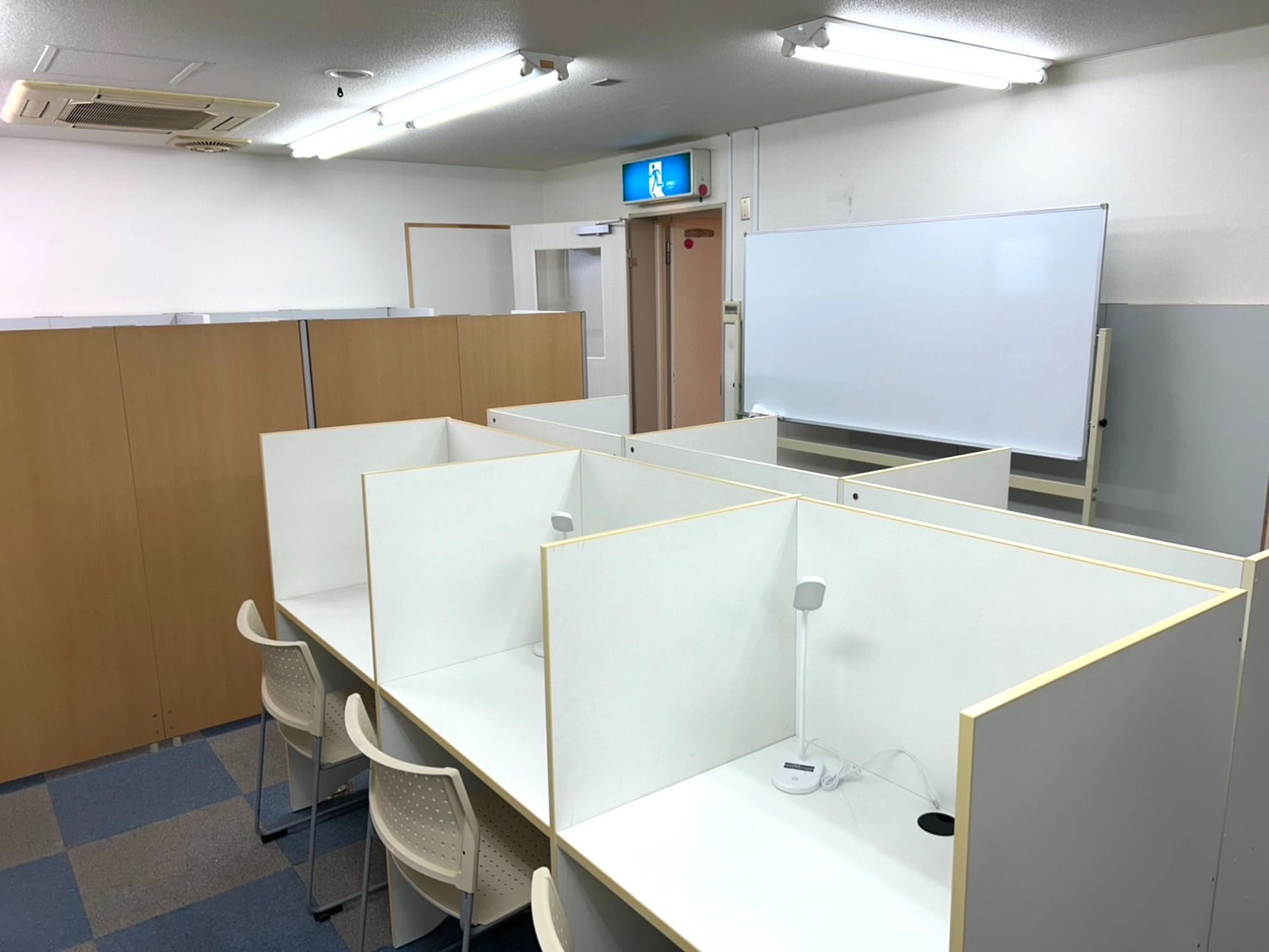 自習室としての評価 | 白を基調とした明るく清潔な空間。扉付きの個別ブースがあり、オンライン動画講義の受講にも便利。 |