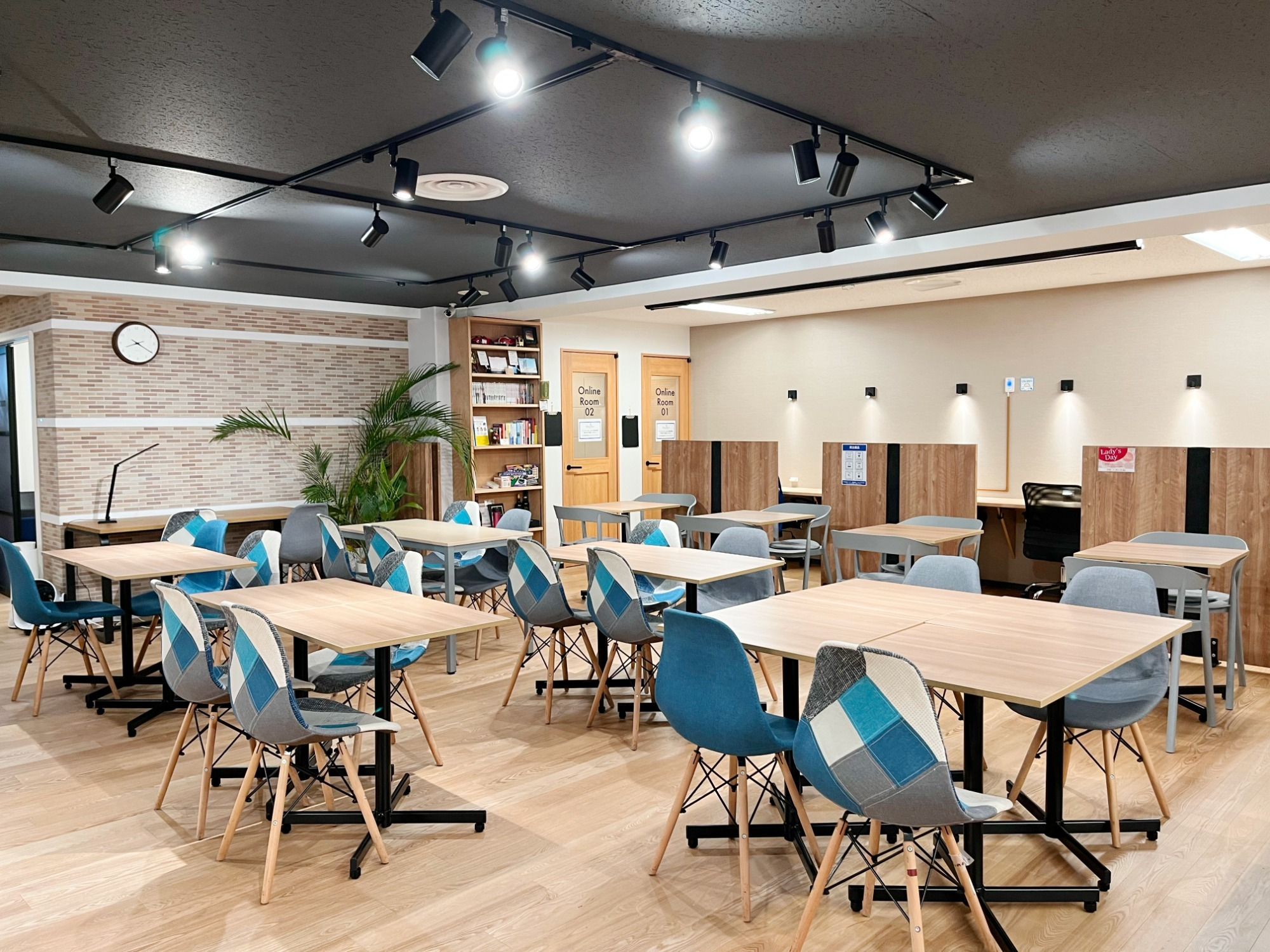 話せる部屋と静かな部屋が分かれており、横幅90cmの広い机でゆったりと作業できる自習室です。参考書や資料を広げて勉強したい学生・社会人に最適です。